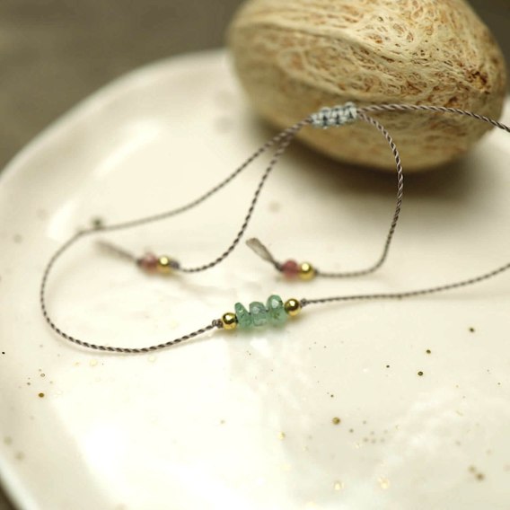Materiały: kompozyt złota 585, szara nylonowa nitka, rubin i szmaragd. Długość: uniwersalna, możliwość regulacji.