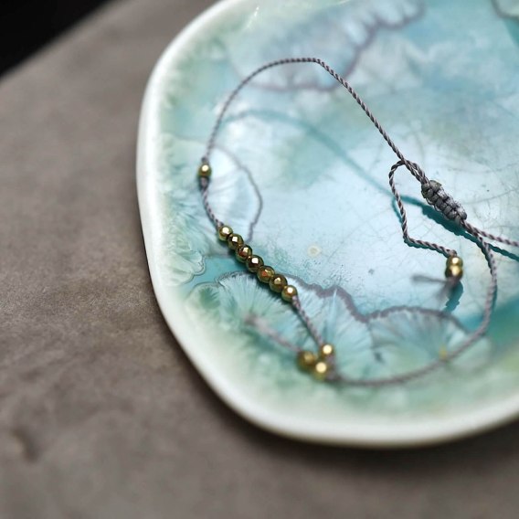 Materiały: kompozyt złota 585, szara nylonowa nitka i hematyt. Długość: uniwersalna, możliwość regulacji.