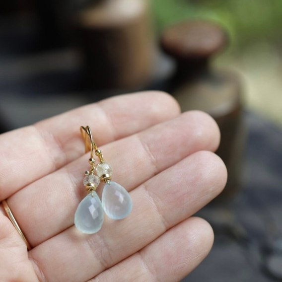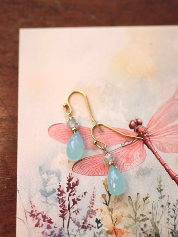 Materiały: srebro złocone próby 925, chalcedon i akwamaryn. Wielkość: 3,3 cm.