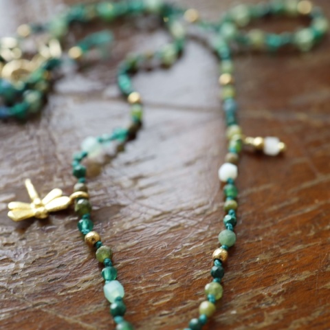 Wykonany ręcznie z naturalnych kamieni nawlekanych i wysupełkowanych na zielonej, nylonowej nici.