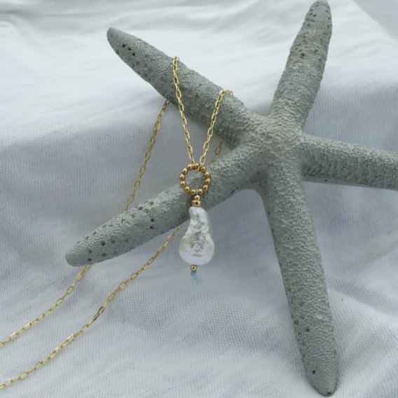Materiały: srebro złocone próby 925 i perła. Długość: 45 cm + 3 cm regulacji.