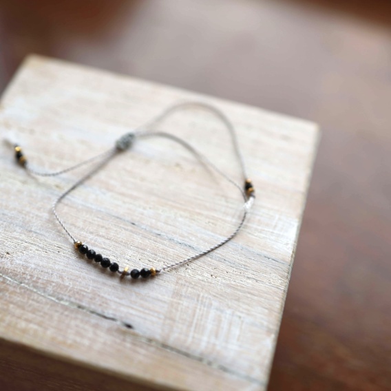 Bransoletka z czarnym turmalinem na szarej nylonowej nici - złote wykończenie
