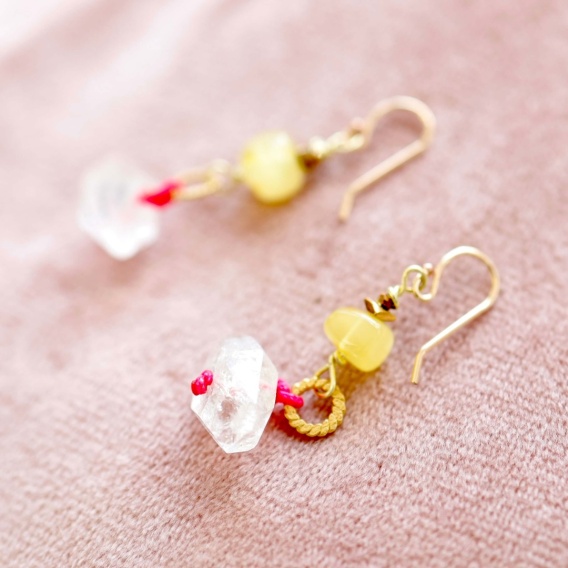 Srebrne złocone kolczyki z herkimerem, bursztynem i neonowo różową nitką.