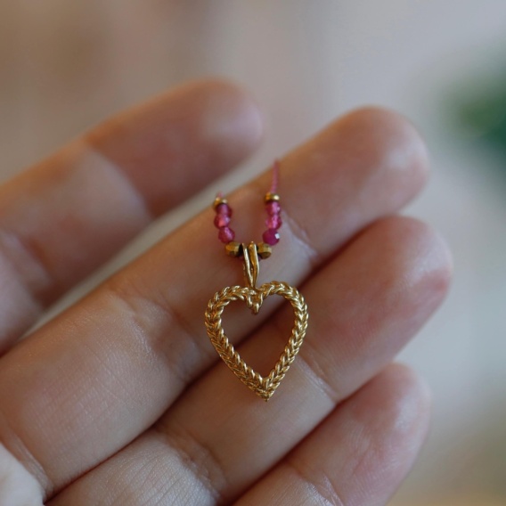 Naszyjnik z różowym jadeitem i kwarcem – z pozłacanym sercem i regulacją długości 🌸💫Ten delikatny naszyjnik został wykonany ręcznie na wytrzymałej nylonowej nici w odcieniu pudrowego różu. Uroku dodają mu fasetowane koraliki z różowego jadeitu i kwarcu różowego – kamieni miłości, łagodności i równowagi emocjonalnej 💕Centralny punkt kompozycji to pozłacane serce z wyjątkowego, starego wzoru – ręcznie wykonana zawieszka ze srebrozłoconego srebra. Całość uzupełnia minimalistyczne, ale wygodne zapięcie typu Goldfit, a suwana regulacja na supełku umożliwia dopasowanie długości od 40 do 50 cm.