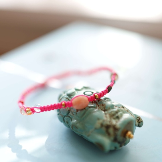 Ta bransoletka jest tworzona na bazie różowej nylonowej nici, która symbolizuje siłę, energię i odwagę. Pomiędzy wyplecioną nitką znajdują się autentyczne kamienie szlachetne - kwarce, koral, onyks zielony, perła. Twój nadgarstek zostanie wspaniale podkreślony dzięki wyrazistym kształtom kamieni i precyzyjnym wykonaniem. Pleciona bransoletka jest lekka, wygodna i elastyczna, dzięki czemu idealnie dopasowuje się do Twojego nadgarstka.